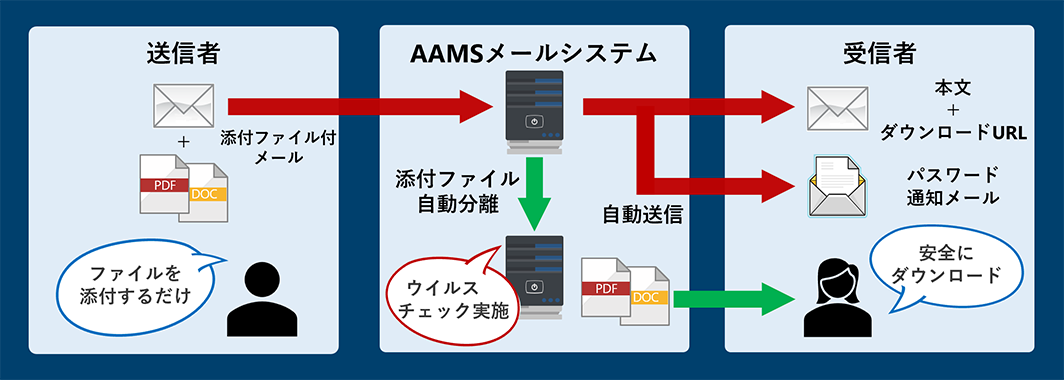 AAMSをご利用ではないお客様も、添付ファイル付きメールをAAMSに転送する設定を行うことでご利用いただけます。