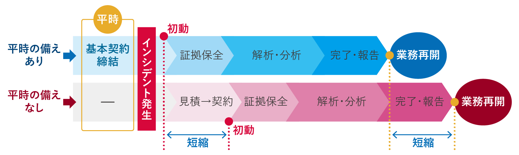 インシデント発生時にスピーディな初動対応を行うために、平時の備えとして無償でご契約いただけます。