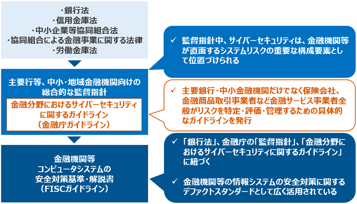 こうした状況を背景に、金融庁は、2024年10月、監督指針で示したシステムリスクの中でも、特にサイバーセキュリティに重点を置いた「金融分野におけるサイバーセキュリティに関するガイドライン」(以下、金融庁ガイドライン)を発行しました。金融庁の監督下にある金融機関等*が自社の現状と課題を把握し、必要な改善策を計画的に実施することで、金融業界全体のサイバーセキュリティへの対応力の底上げと態勢強化を推進することを目指しています。