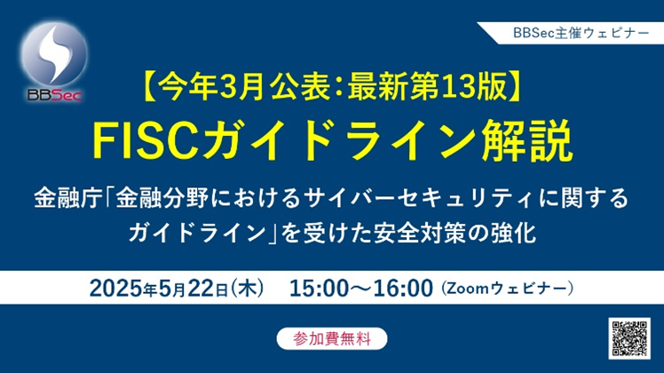 情報セキュリティコンサルティングなどセキュリティに特化したサービスを提供する株式会社ブロードバンドセキュリティ(本社:東京都新宿区、代表取締役社長:滝澤 貴志、以下 BBSec)は、2024年10月4日に金融庁から公表、適用開始されている「金融分野におけるサイバーセキュリティに関するガイドライン」および、2025年3月21日に公益財団法人金融情報システムセンターから公表された「金融機関等コンピュータシステムの安全対策基準・解説書」(第13版)に対応する金融機関等向けの対策支援サービスをリリースいたします。また、関連ウェビナー を2025年5月22日に開催いたします。