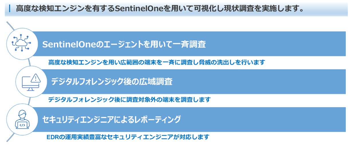 本サービスは、サイバー攻撃を受けた可能性のある環境を迅速に診断し、初動対応や今後の対策立案を支援します。