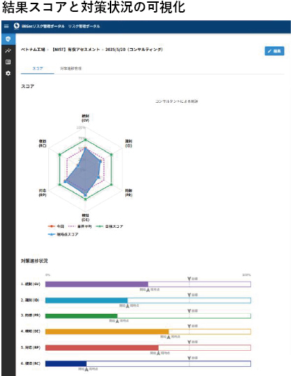 ※1 2022年当時提供のサービス。2026年現在は、NIST CSF改訂を反映してベース基準を更新し、アセスメント結果の可視化からその後の対策進捗管理までを「リスク管理ポータル」上で一元管理いただける「簡易コンサル付き情報セキュリティセルフアセスメント」として提供しています。