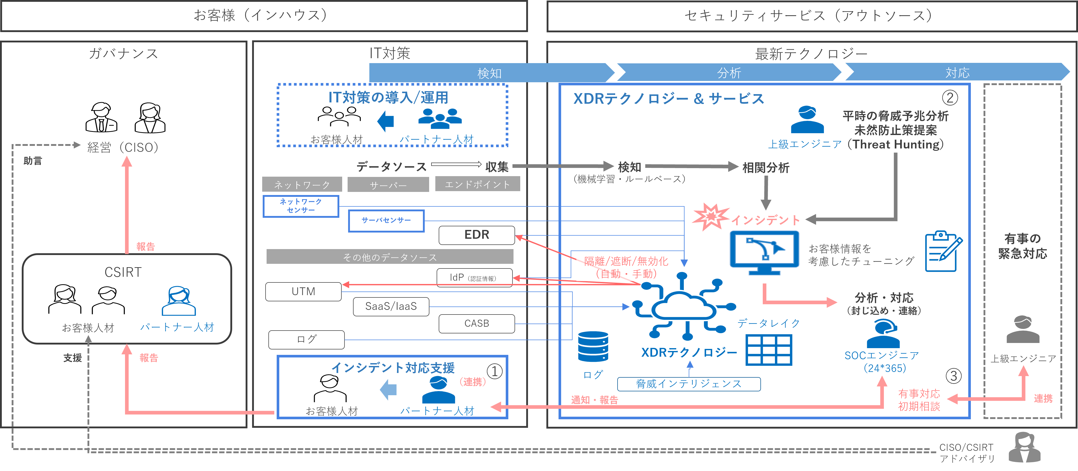 XDRによる分析・対応に加え、専門のエンジニアが24時間365日対応するだけでなく、平時における能動的かつ高度な脅威分析サービスを利用できます。