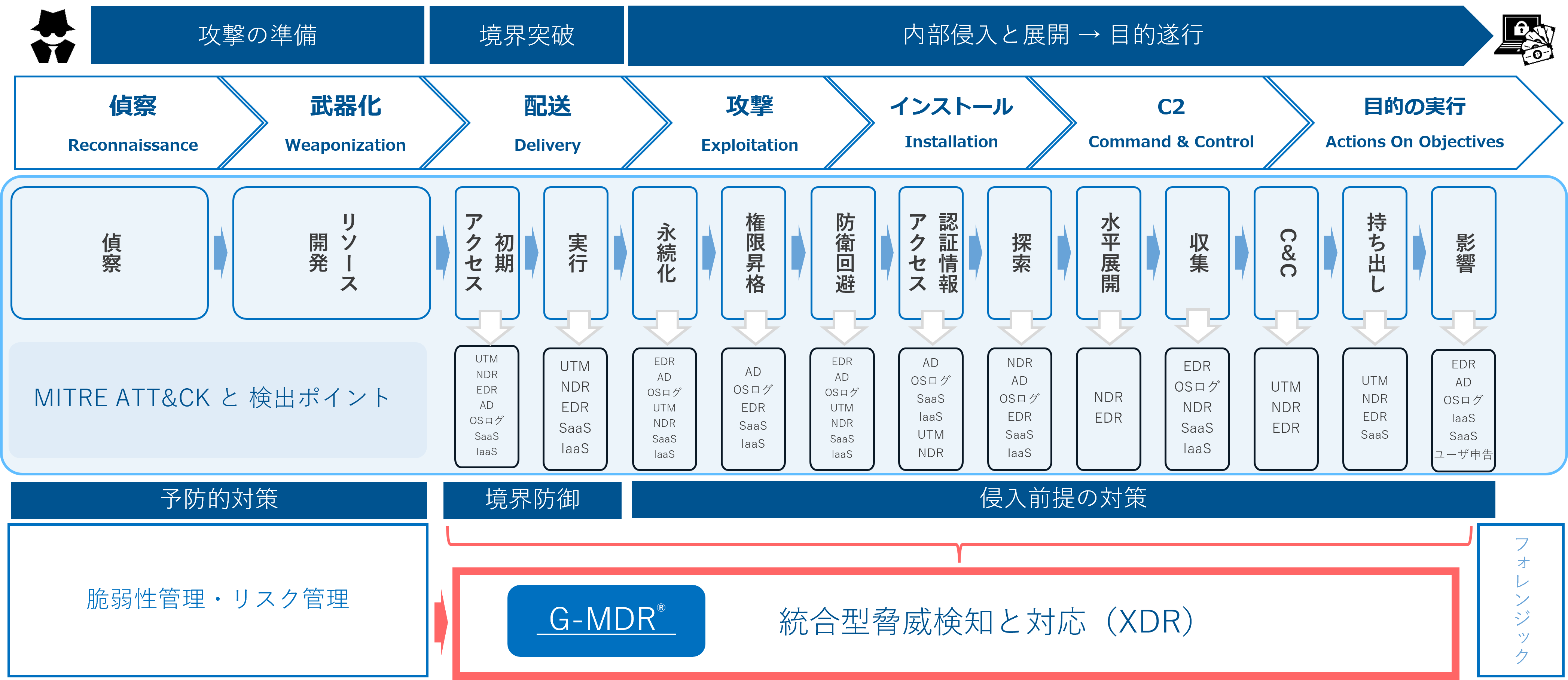 従来型の単なる監視・運用サービスではなく、①発生したケース(アラートの分析結果)の影響度の判定や ②スレッドハンティング等の高度分析サービス、③有事の際の緊急対応の初期相談までを含めたサービスであり、MITRE ATT&CKの「初期アクセス」から最後の「影響」までサーバー攻撃のライフサイクルの全てに対応できるワンストップサービスです。